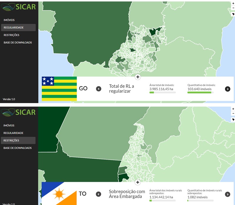 O mapa com os dados do CAR por UF e por município pode ser acessado clicando aqui. É possível acessar informações sobre o total de imóveis e a área cadastrada, adesões ao PRA, total de RL a regularizar, total de APP a recompor e áreas de uso restrito a regularizar.